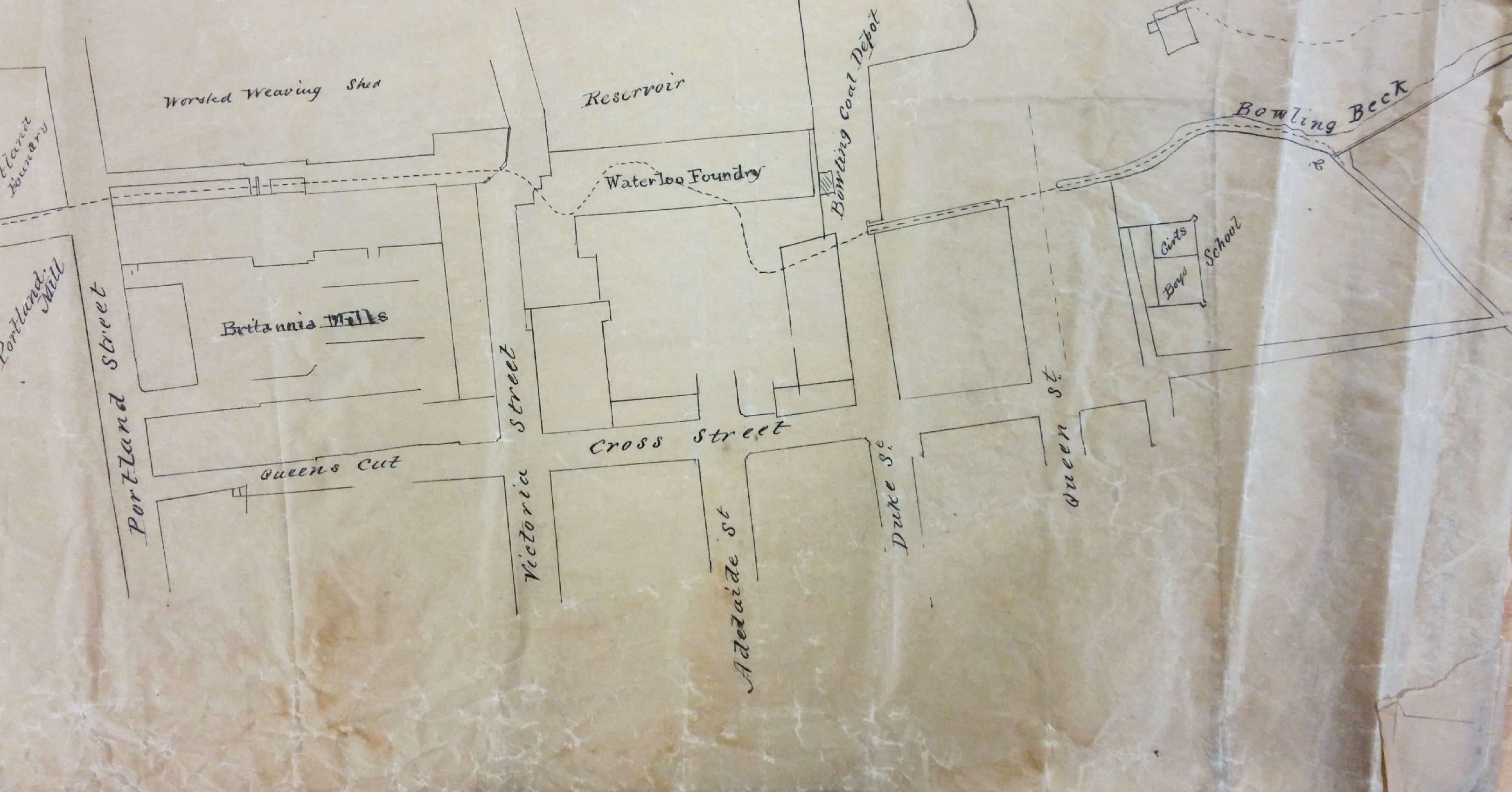An 1800 town plan shows this area as totally rural in character. Everything now visible was developed from green field sites in the third and fourth decade of the nineteenth century. None of the institutions mapped are listed in the Pigot’s 1834 trade directory but the library has a freehold sale plan, dated 1847, by which time the road plan was essentially complete. This sale plan shows the Union Foundry which was built by Quaker ironfounder Robert Crosland in the 1830s, and the Britannia Mill, erected in 1836. A good deal of land is owned by the partnership of William Greenwood and Benjamin Berry who made spinning frames at Prospect Mill, Bowling and Portland Mill. Another landowner was worsted spinner John Wood of Horton Hall, either alone or with his partner as Wood & Walker. Wood played a vital role in establishing ten hour work days at textile factories. He removed to Hampshire in 1835 and his partner was a very different type of man.