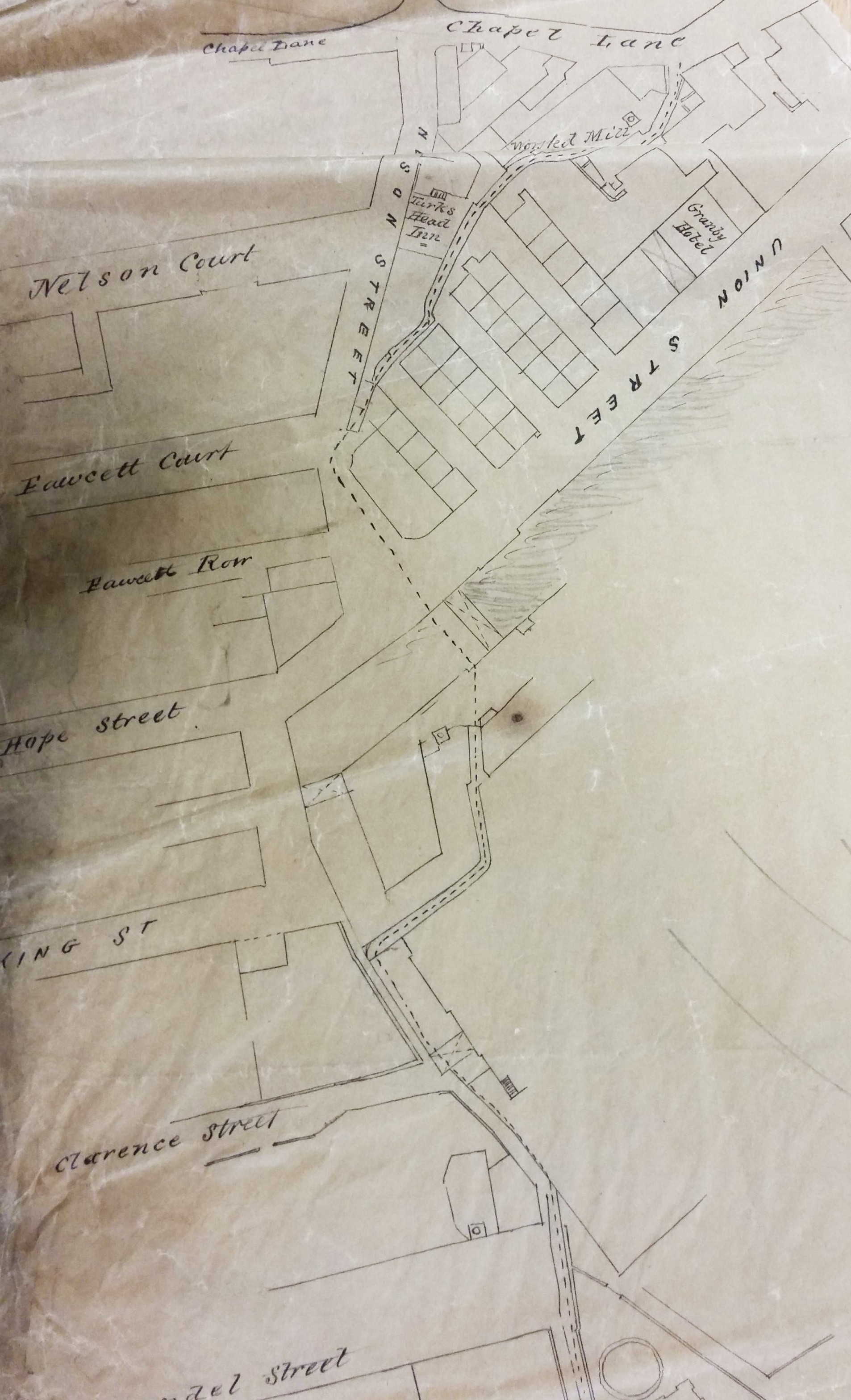 The Bowling Beck clipped the site of the Portland Foundry and ran under Croft Street past a small ‘gas house’ close to the Union Foundry where Robert Crosland made hydraulic presses. The beck’s rather irregular course seems to include an open section. At the origin of the old Nelson Street the beck is certainly open. This may have lent interest to any patrons standing at the back of the Turk’s Head Inn. Actually ‘inn’ may have been a euphemism. The Turk’s Head appears in the Bradford Observer from time to time but it is always described as a ‘beer shop’. In 1840 its owner, John Smith, was denied a licence at the Brewster sessions but the Turk’s Head was open again by 1845 when it got Squire Auty, constable of Horton, into serious trouble. Auty had attended a supper there but, having noticed card playing, did nothing to stop it. If the Turk’s Head customers did stand by the beck its reported state would probably not have encouraged them to linger. The effluent from Bowling Dye Works was considered especially noisome even by Bradford standards. If the beer shop sold its own brew it is to be hoped that they had access to some less deadly source of water.