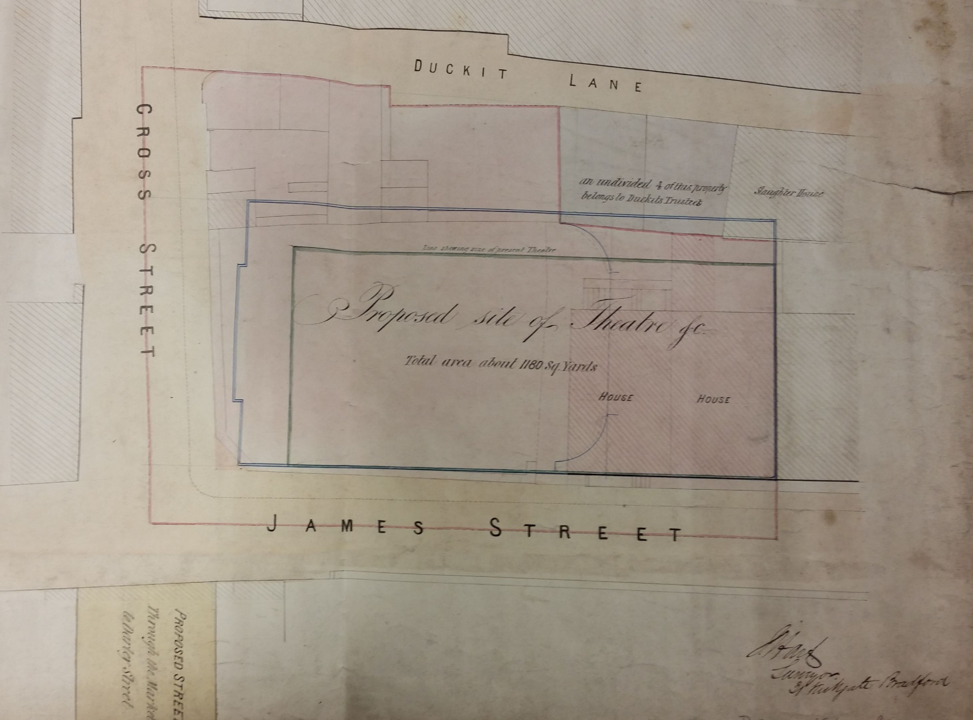This map from the Local Studies Library reserve collection would seem to be the plan of a theatre or music hall drawn up prior to its enlargement. When I first saw it I recognised the location, between Duckett Lane and James Street, (which connect Godwin Street and John Street) but I could not see how a theatre could ever have been positioned there.  I could not then have named a single Bradford theatre besides the Alhambra and the Star Music Hall. The Star had an important role during the great Manningham Mills strike of 1890/91 when its lessee, a Mr Pullan, placed his premises at the disposal of the strike committee during the early days of the dispute. In Charles Dickens’s rather neglected novel Hard Times Mr Sleary, a circus manager, says: ‘People must be amused…they can’t be always a working, nor yet they can’t be always a learning’. So, how were they amused in Bradford? In the late eighteenth and early nineteenth centuries itinerant entertainers visited public houses, and there were also visits from fairs and circuses. It appears that permanent theatre building had commenced by the 1840s.