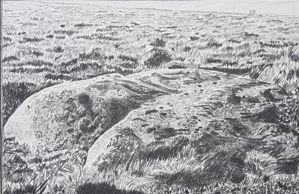 If you had participated on one of Sidney Jackson’s walks across an upland area near Bradford he certainly would have pointed out to you any cup and ring marked stones (petroglyphs or inscribed stones) that you passed. In this article I have included a beautiful drawing SJ made of such a stone on High Moor, near Keighley and two of my photographs of well-known examples on Baildon Moor. I must be honest and say that I am in a minority but I don’t share the enthusiasm that many people evidently feel for these objects. My main interest is in Industrial Archaeology so that I visit Baildon Moor for its treasure house of quarries and coal shafts rather than insights into pre-history. There is an inscribed stone quite near in Northcliffe Woods but its main value to me is to indicate that a glacial erratic gritstone boulder has been on the surface in this position for 4000 years.