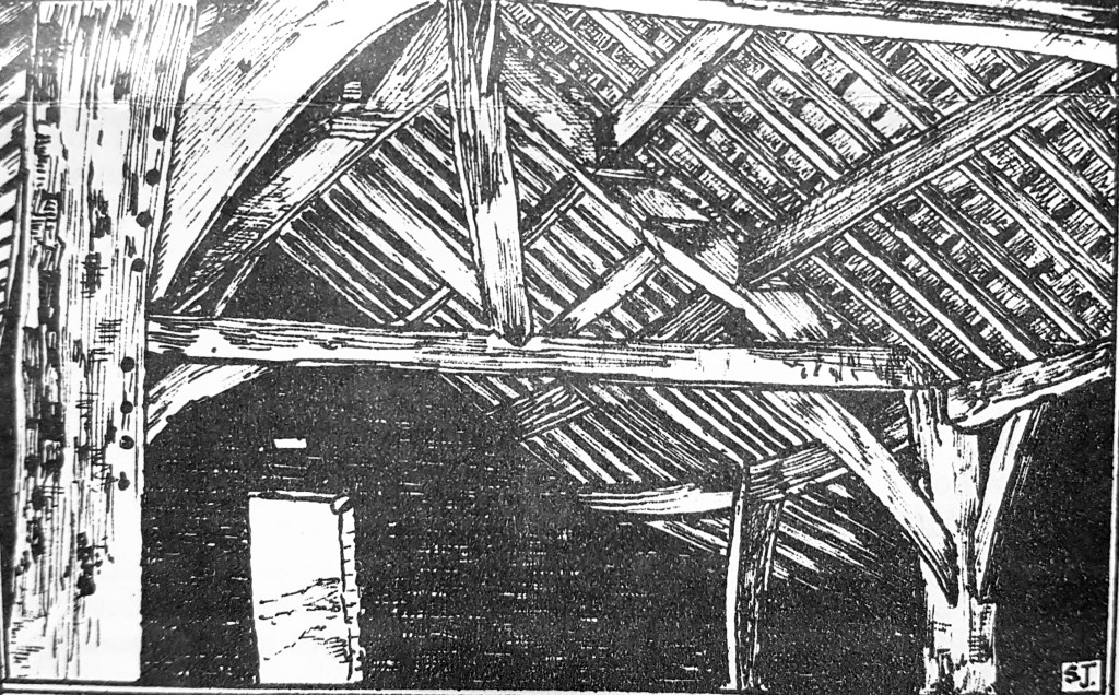 The barn is 120 feet long, 40 feet wide, and consists of eight bays. The external stone walls, pierced for lights especially at the gable ends, are load-bearing so this is not a timber-framed structure, although many wooden members are incorporated. The oak upright timbers support the roof trusses. They stand on stone bases since wooden posts buried in the soil inevitably rot within a century or so. The oak roof trusses are of the ‘king post’ type. The supporting timbers running lengthways along the roof are called purlins. The purlins engage on the ‘principle rafters’: the other roof members are ‘common rafters’. The rafters support stone slates which keep the barn weather-proof and mean that the pitch of the roof is kept relatively low, unlike a steeply pitched thatched roof. There is a solid stone and brick floor and two pairs of doorways with arched porches. Doors placed opposite one another in a barn indicate that it was once used for threshing. The through draught helping the separation of grains from the chaff. The stone surface was the threshing floor which needed to be kept clean. The aisles are fitted with cattle stalls so, like many northern barns, it was used both for crop storage and stock. In his original article Sidney Jackson rightly pointed out the value of such barns to those who appreciate fine carpentry.