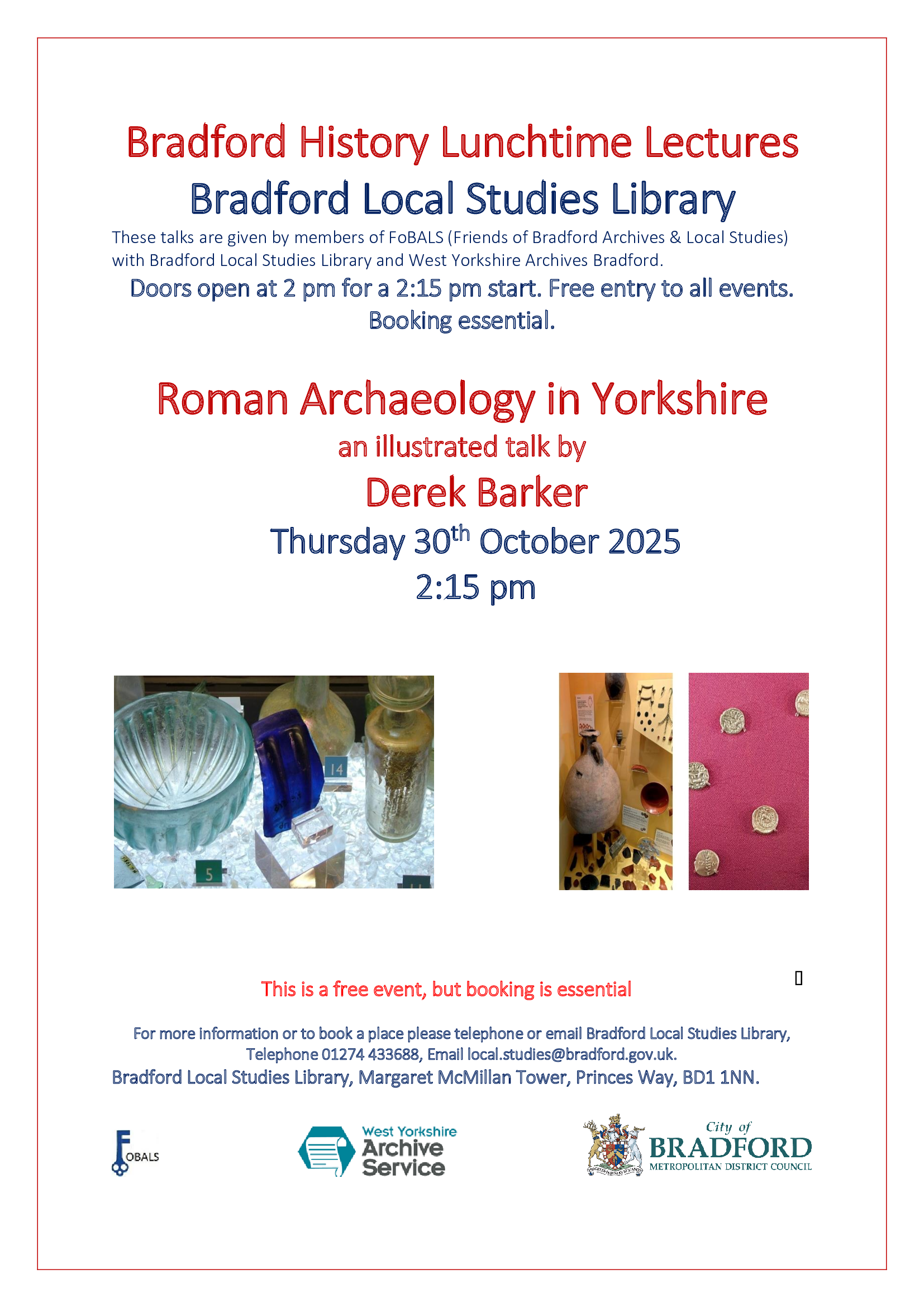 For more information or to book a place please telephone or email Bradford Local Studies Library, Telephone 01274 433688, Email local.studies@bradford.gov.uk.