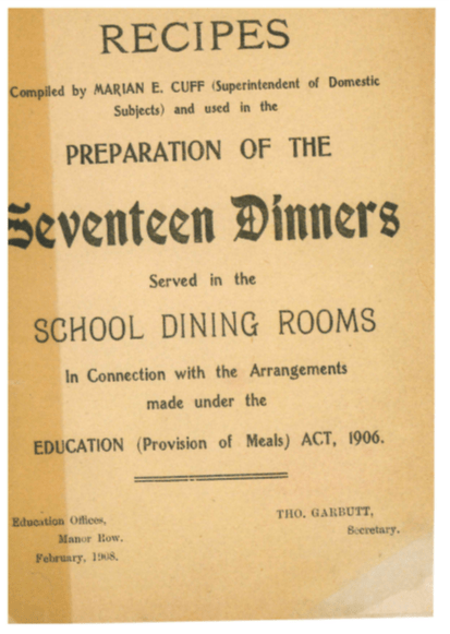 Bradford Local Studies holds an original 1906 school meal recipe booklet, compiled by Marion E. Cuff, Superintendent of Domestic Subjects.