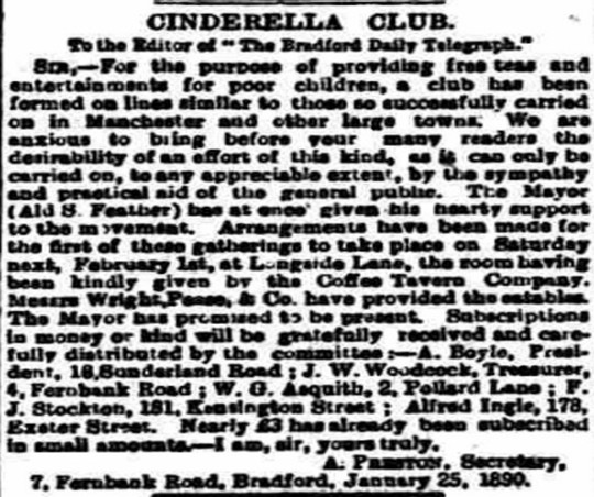 Between 1890 and 1901, the Bradford Daily Telegraph ran the Telegraph Cinderella Fund, raising £4,842 18s. 1d. to support this work.