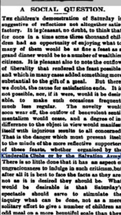 Only two weeks later, on 11 February 1890, the Telegraph published a lengthy commentary titled “A Social Question”, discussing the work of both the Cinderella Club and the Salvation Army.