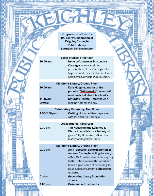 As many of you will know, Keighley Library is 120 years old this year. It was the first library in England to be financed by the Scottish American billionaire and educational philanthropist, Andrew Carnegie and is an architectural gem of the town. It opened its doors on 20 August 1904 and to celebrate this milestone, a programme of events has already been launched for the year ahead 2024-2025 with regular updates on this site.