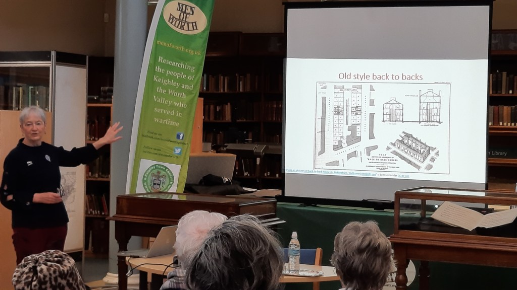 For the last two years, Keighley Local Studies has put on a series of lectures on family and local history by Jude Rhodes, professional genealogist, local historian and accomplished speaker. Jude has covered topics as diverse as back-to-back housing, nursing history and one place studies and a history of mental health and asylums. Each talk has been fully illustrated with a power point presentation and library staff have put out displays of related original documents, gathered from the wonderful Keighley Local Studies’ archive that covers the Keighley district.