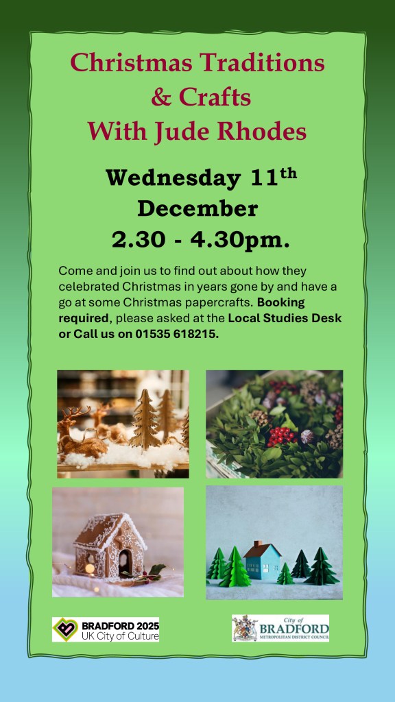 Thank you to all who attended, please find an earlier blog with future talks listed into next year. Please note these are free events and also a place booking is required for that on the 11th December 2024, Christmas Family Traditions and Crafts, contact Keighley Local Studies. Poster with details is with this blog.