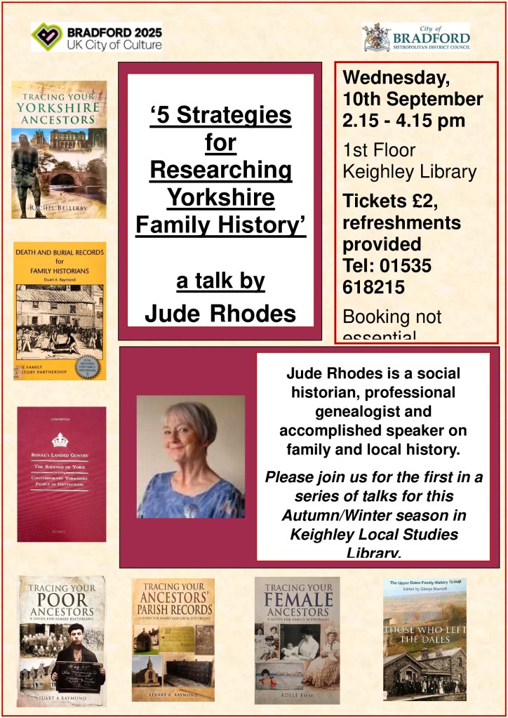 Keighley Local Studies has a full programme of talks and events for Autumn/Winter, and details of these will be available on this site, on social media and in the library shortly, please look out for them.