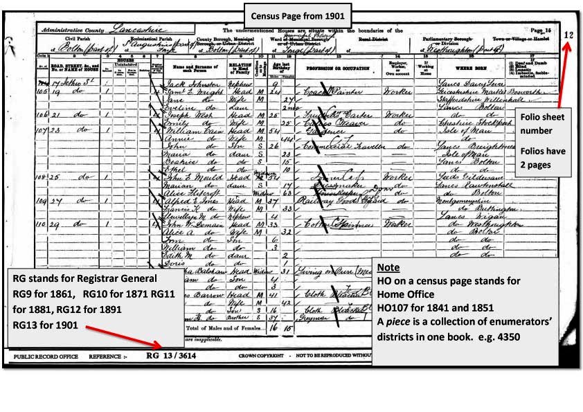 In the week preceding census night, the appointed enumerator delivered the forms to all households in an Enumeration District (approximately 500 people). Censuses did not strictly follow county boundaries. The first page of each District states the route taken. Everyone who slept in the house that night had to be included, even if it wasn’t their permanent home. No person absent was included so salesmen, for example, were included in the census where they lodged on their journey. Census dates are important and vary but they were taken on a Sunday as the night when most people would be at home. Earlier in the year is preferred, since 1851, because many people helped with harvesting in the summer and daylight was always needed for enumerators to carry out their rounds. Forms were filled in for anyone who was unable to read and/or write and there are often many spelling mistakes and some names spelled differently.