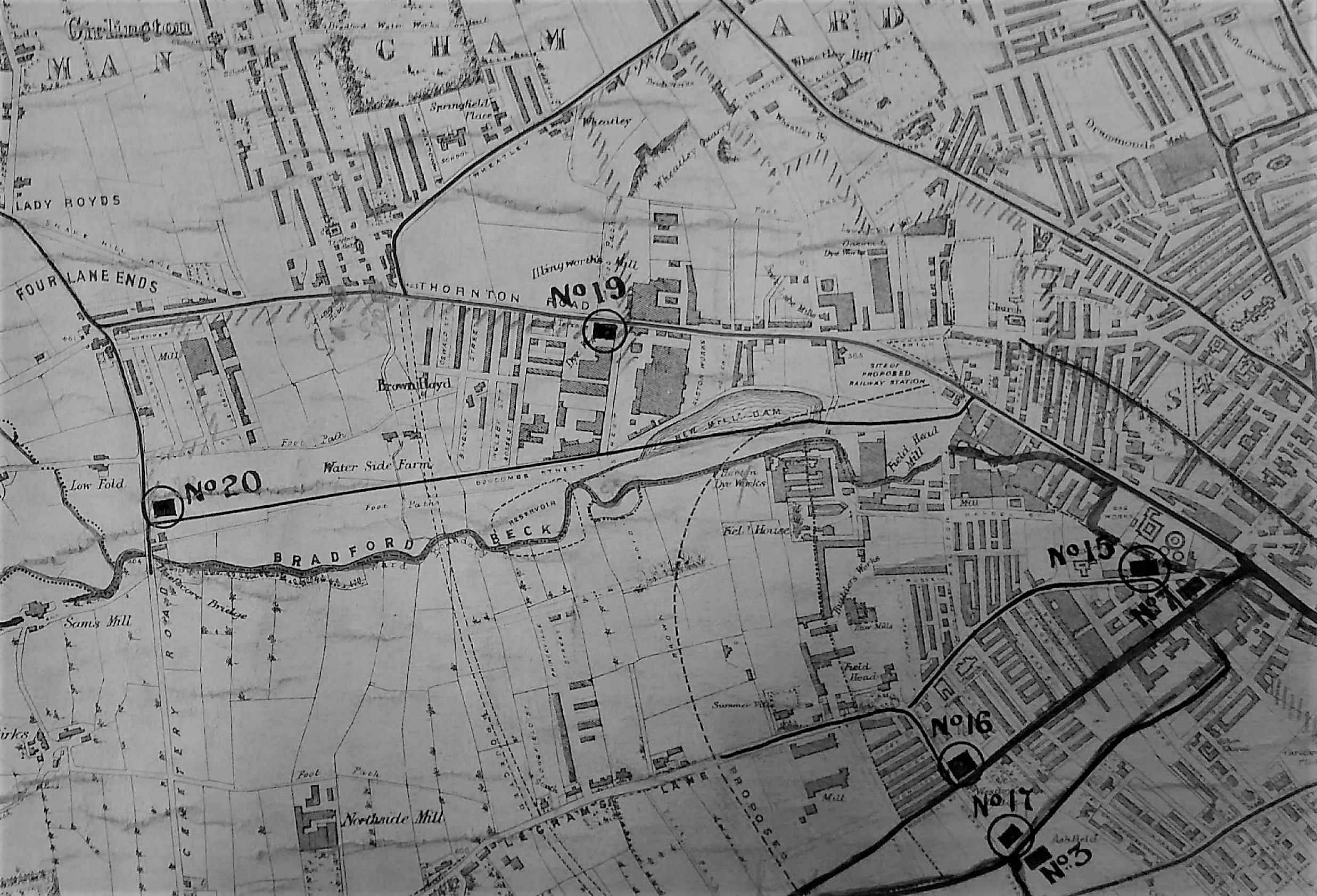 This third map shows an area slightly further north. There have been additional train track developments. The Great Northern Railway had opened its service to Leeds from Adolphus Street station in 1854 but the rival Midland Railway service, via Shipley, ended at a station more convenient to the town centre depriving GNR of customers. In consequence, around 1867, a track loop was constructed connecting the GNR line to the L&Y track at Mill Lane junction and allowing passengers from Leeds access to Exchange Station. Nearby St Dunstan’s passenger transfer station was also opened. The loop is clearly visible on the map north of Ripleyville. In describing the work involved in taking the GNR railway line from the Exchange Station towards Leeds, Horace Hird (Bradford in History, 1968) again mentions the activities of Samuel Pearson & Son who took over responsibility for the material excavated from the necessary cutting. The cutting spoil created a ‘great mound’ and for 15 years 60 men were employed making drain pipes, chimney pots and bricks from this material. Their Broomfield brick works is clearly indicated on the map above the loop. The line seen curving away to the left edge of the map, opposite the brick works, services a series of coal drops which are still visible, in a ruinous state, off Mill Lane today.
