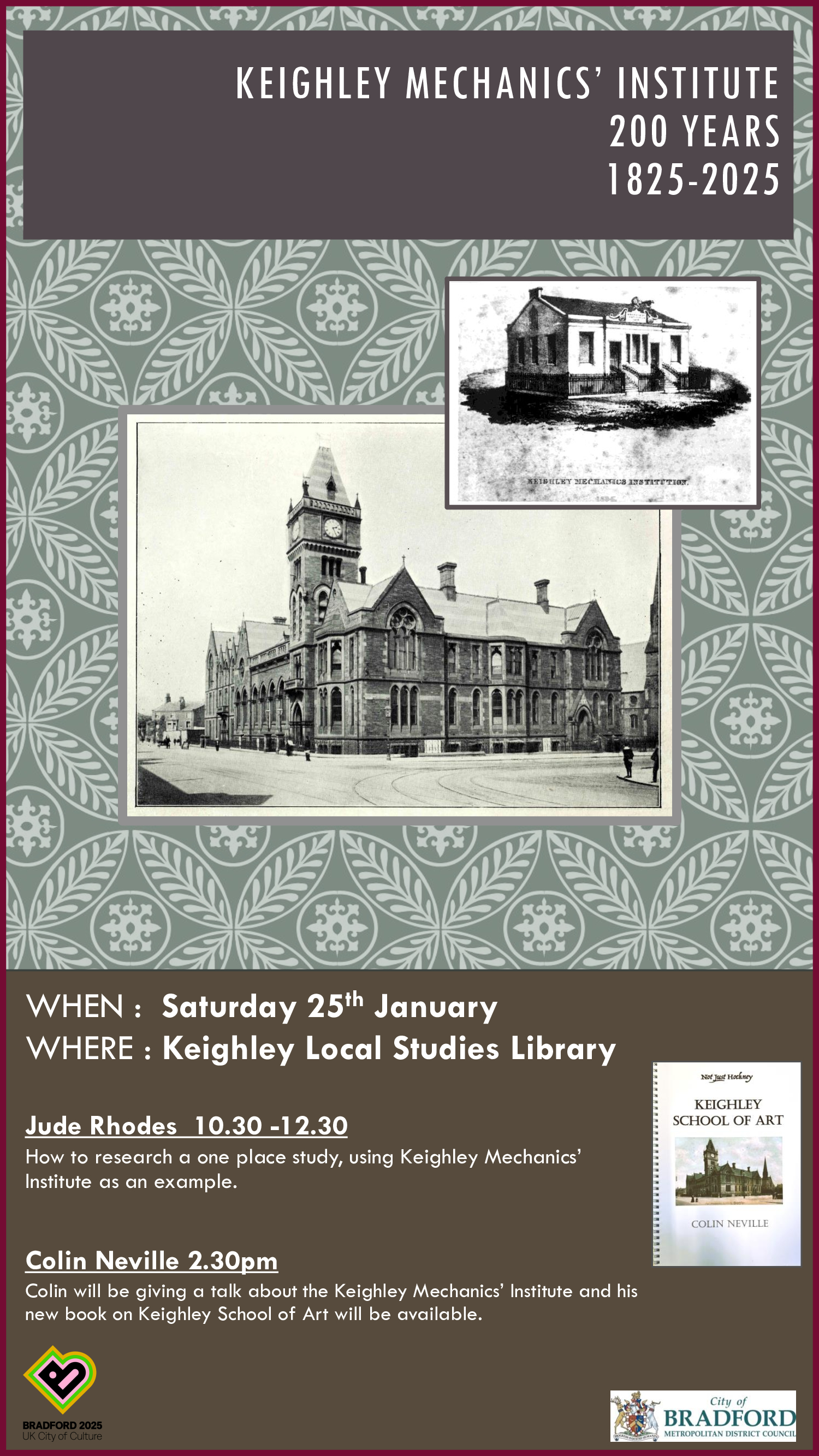 Founded formally by 4 working men at a public meeting held on 14 February 1825, join Jude Rhodes, lecturer in local history and genealogy and the Local Studies’ staff, as they take you through a one place study of this institution, its history, influence and far-reaching impact. We shall look at the characters whose lives the institution and its member influenced, including the Brontë family and later how it benefited scholars of Keighley’s Grammar School, including internationally famous historians: Lord Asa Briggs and Sir Herbert Butterfield. We shall also look again at the Institute’s associations with Andrew and Louise Carnegie and their ultimate gift of the Keighley Public Library to the town in the 1890s.