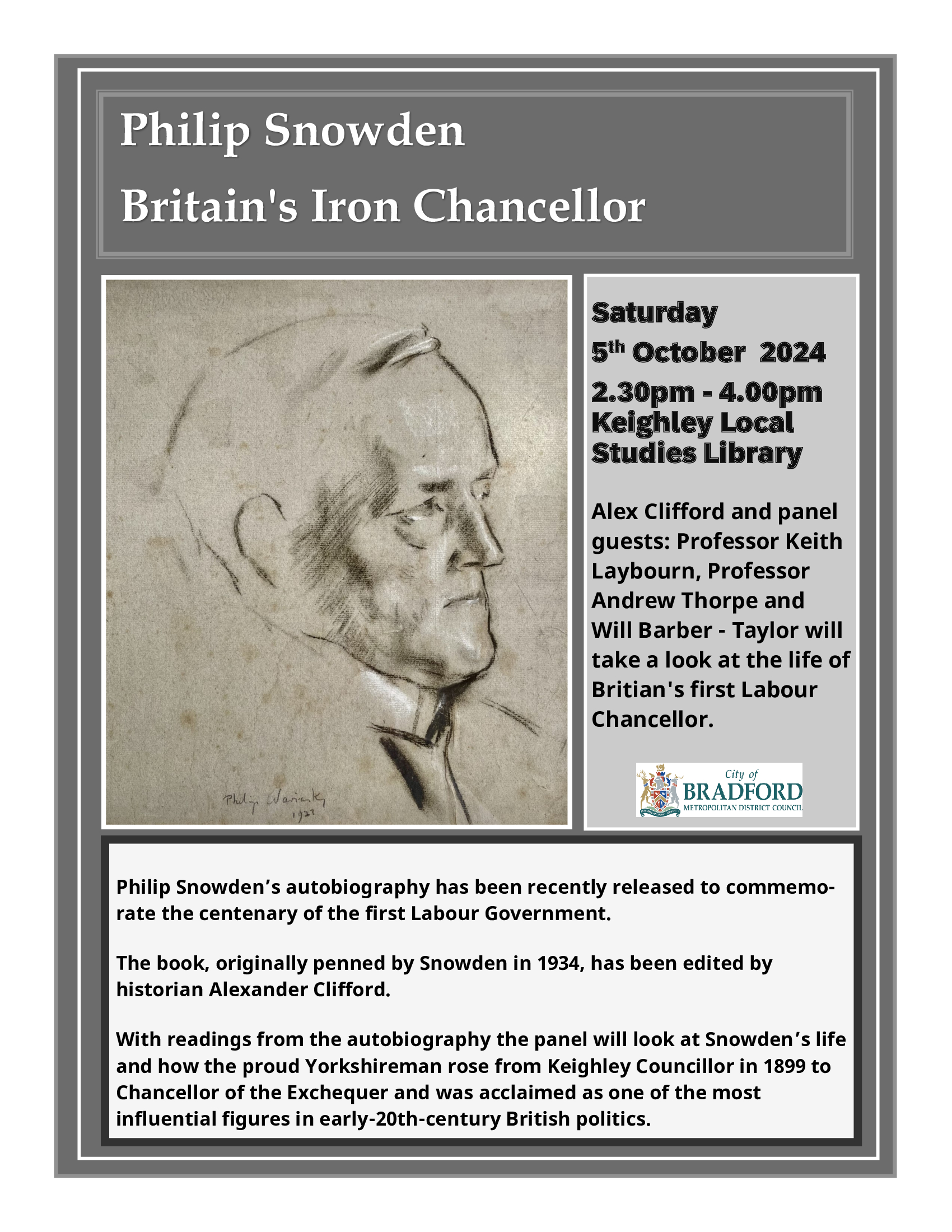 Philip Snowden was Chancellor of the Exchequer in the first two Labour governments of Great Britain in 1924 and1929. He was a fine orator, apparently second only to Keir Hardie and toured the country making speeches for the Independent Labour Party. He served on Keighley Town Council in 1899 and Keighley’s School Board.