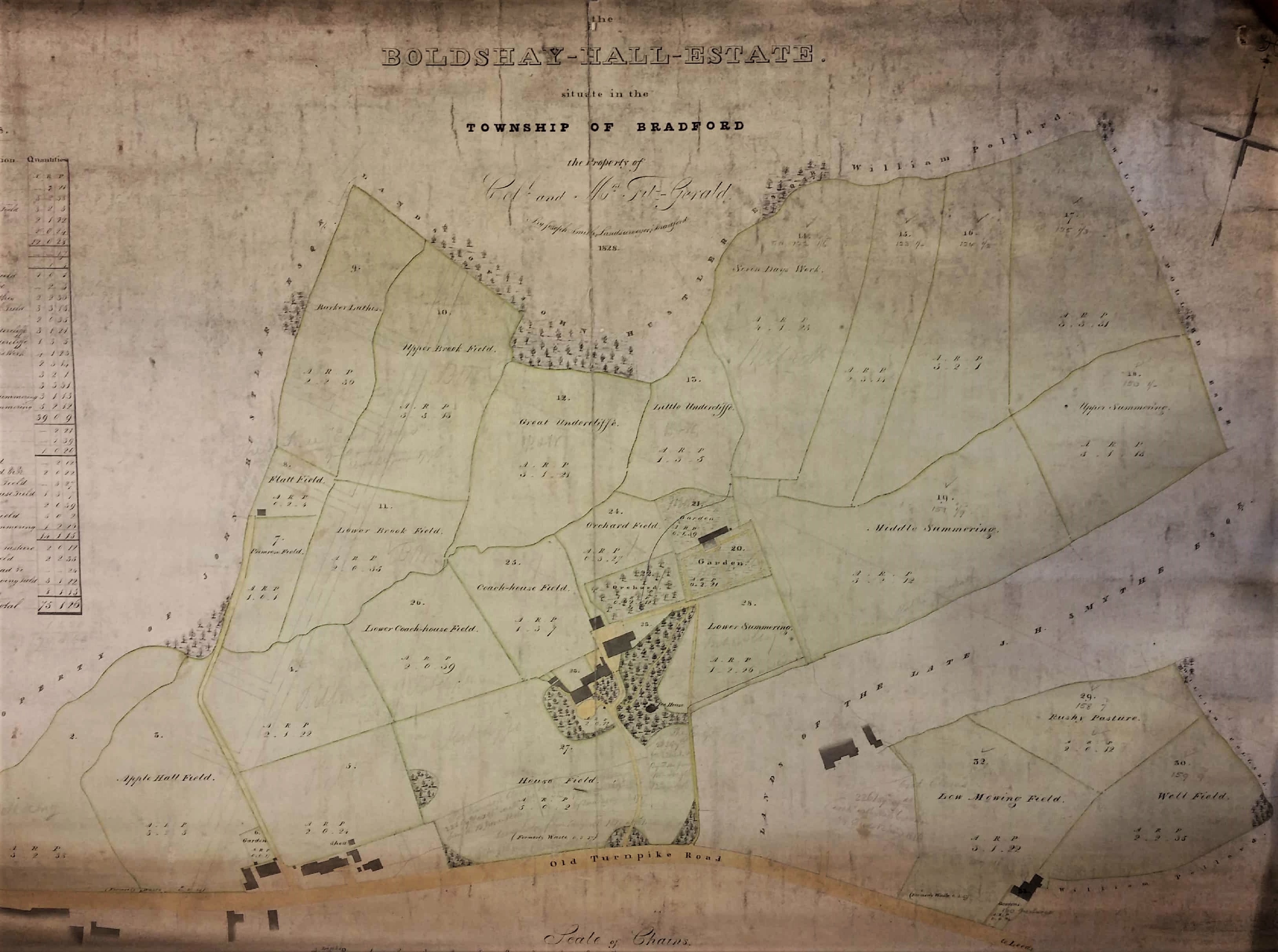 The hall itself is the large building in the centre of the group. I assume the rest are stables, farm buildings and coach houses; note the presence of an ice house. The agent for the estate, and other Fitzgerald properties, was Joseph Smith. Joseph Smith must have surveyed this map. He was succeeded by his son George Belk Smith who had designed the Bradford – Eccleshill turnpike in 1826. There are pencil annotations which are hard to read but seem, at least in part, to be records of the years in which certain parcels of land were acquired for the estate. I would like to know how long the Fitzgeralds lived at Boldshay Hall. After the death of Colonel Fitzgerald the estate passed to his son Major Henry Thomas George Fitzgerald (1820-1890) who had been born and baptised in Bradford but probably didn’t live here; his address is usually given at Maperton House, Somerset, which the Fitzgeralds also owned. Baines directory of 1822 confirms that Colonel Fitzgerald was in residence at that date but by the time Fitzgerald died in 1850 the Leeds Mercury recorded that he was ‘formerly of Boldshay Hall’. The 1828 map itself includes a list of tenants with their holdings, but nobody is leasing the hall where presumably, six years after the directory was published, the family still lived. It would appear likely that Colonel and Mrs Fitzgerald moved to Maperton House in the late 1820s. Could the resultant need for records of their local land holdings have been the reason that the map was originally created?