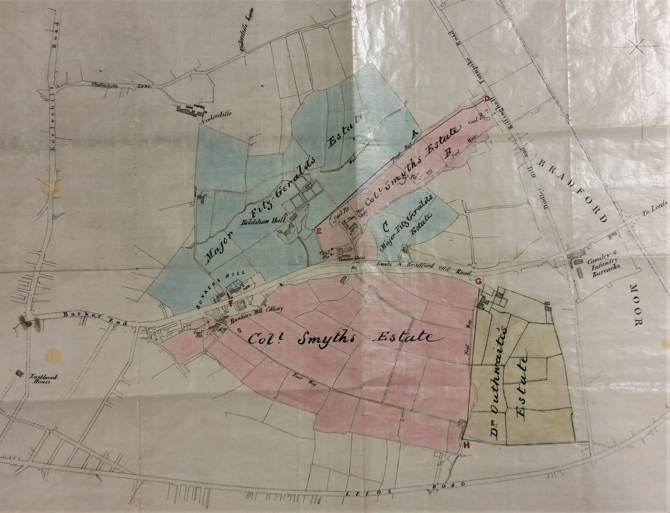 It is always an exciting moment when an important two hundred year old map, which does not appear to represent a copy of one already in the publicly accessible collection, turns up among the Local Studies Library’s reserve material. The title of this map indicates that it produced for Colonel Thomas George Fitzgerald, who was a large landowner in Bradford until his death in the mid-nineteenth century. Local Studies has plans of his holdings elsewhere in the city, but no other copy of this plan of Boldshay Hall as far as I can see. The West Yorkshire Archives also has many documents relating to the estate.