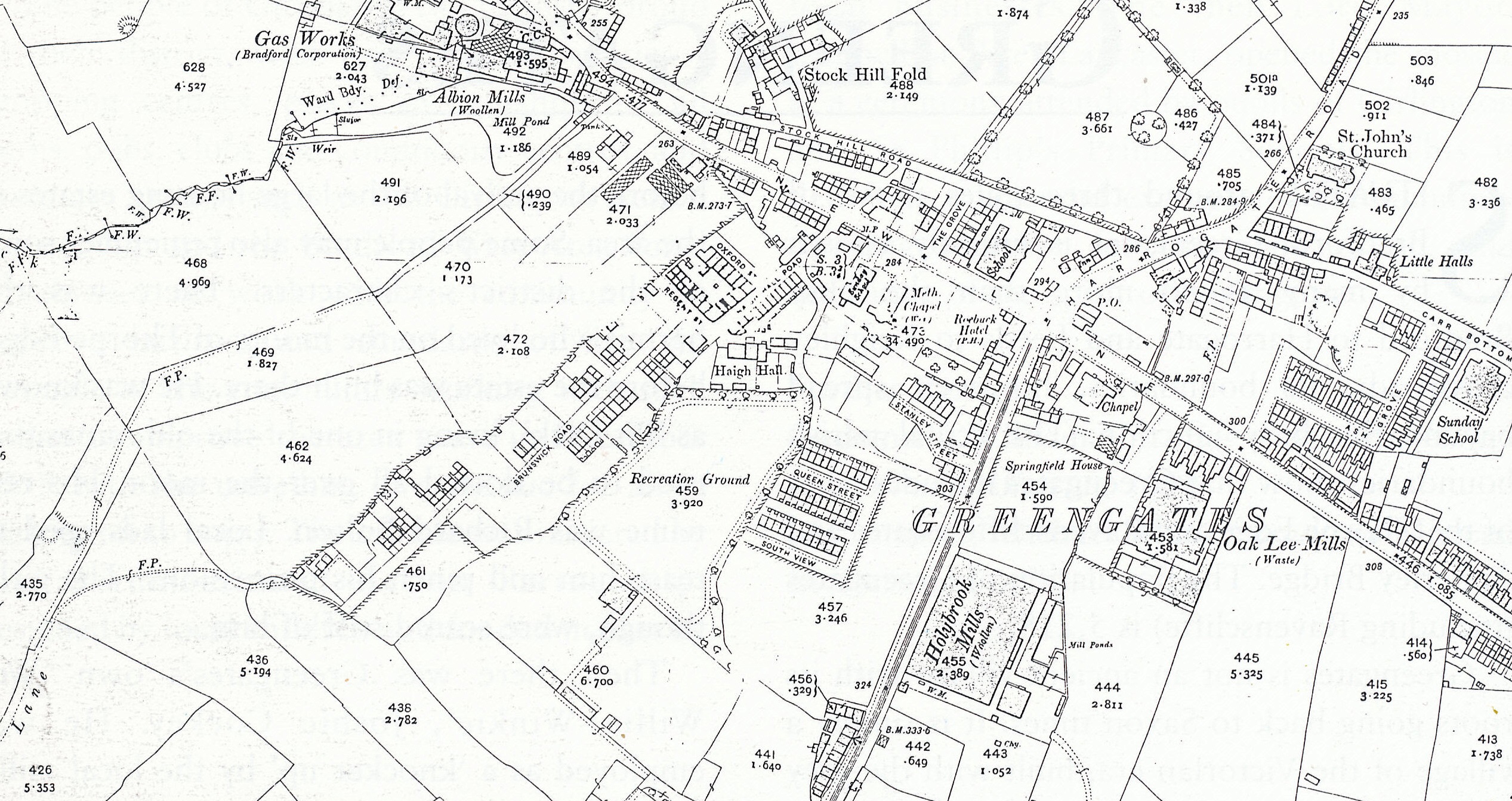 This third map shows an area slightly further north. There have been additional train track developments. The Great Northern Railway had opened its service to Leeds from Adolphus Street station in 1854 but the rival Midland Railway service, via Shipley, ended at a station more convenient to the town centre depriving GNR of customers. In consequence, around 1867, a track loop was constructed connecting the GNR line to the L&Y track at Mill Lane junction and allowing passengers from Leeds access to Exchange Station. Nearby St Dunstan’s passenger transfer station was also opened. The loop is clearly visible on the map north of Ripleyville. In describing the work involved in taking the GNR railway line from the Exchange Station towards Leeds, Horace Hird (Bradford in History, 1968) again mentions the activities of Samuel Pearson & Son who took over responsibility for the material excavated from the necessary cutting. The cutting spoil created a ‘great mound’ and for 15 years 60 men were employed making drain pipes, chimney pots and bricks from this material. Their Broomfield brick works is clearly indicated on the map above the loop. The line seen curving away to the left edge of the map, opposite the brick works, services a series of coal drops which are still visible, in a ruinous state, off Mill Lane today.