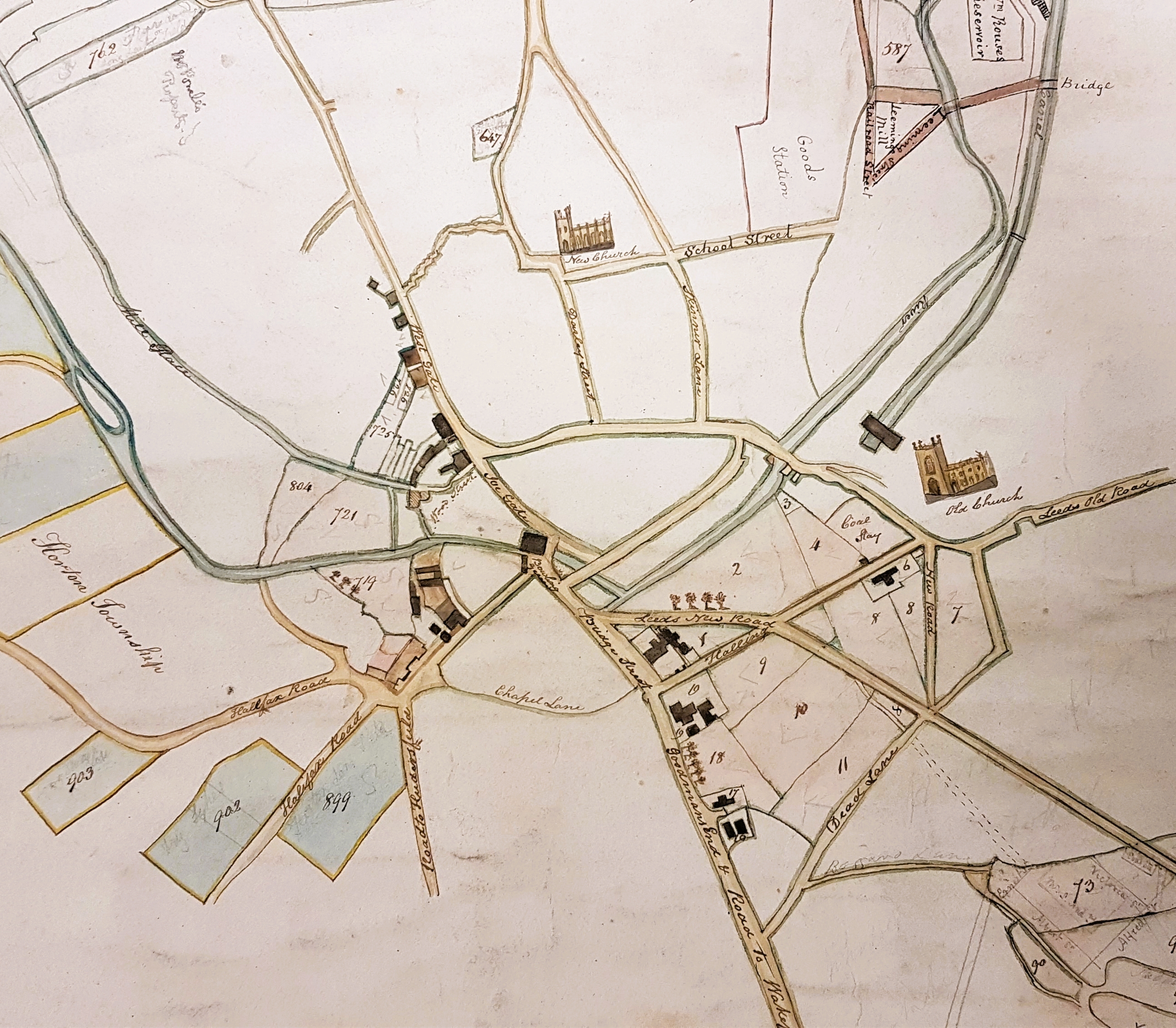 I thought I had made a good start with the this first plan, which is widely reproduced and purports to date from 1800. Here it is easy to see the acute angle made by the Turls (Tyrrel Street) and Chapel Lane/Toad Lane. Toad Lane is an odd name but it is not unique; there are, or were, Toad Lanes in Bingley, Newark and Rochdale. Possibly the name is a corruption of ‘t’owld’ lane: certainly in Bradford the lane is drawn, but not named, on a map as early as c1722. On the above plan building (3) is the Unitarian Chapel which was certainly in existence at this time. An existing town hall is numbered (35) on the map but there is a small puzzle here. The Act of Parliament that appointed commissioners for levying rates, and improving Bradford roads and lighting, was only passed in 1805 and no town hall was to be built for decades. I am very obliged to local historian Kieran Wilkinson who explained this apparent anomaly by telling me that the map of 1800 is not contemporary but was a creation of the late nineteenth century, and marked places both where important local buildings were in 1800, and would be in the future. Let us instead look at a detail from a map that is believed to be contemporary, that of 1802, which is available in the Local Studies Library.