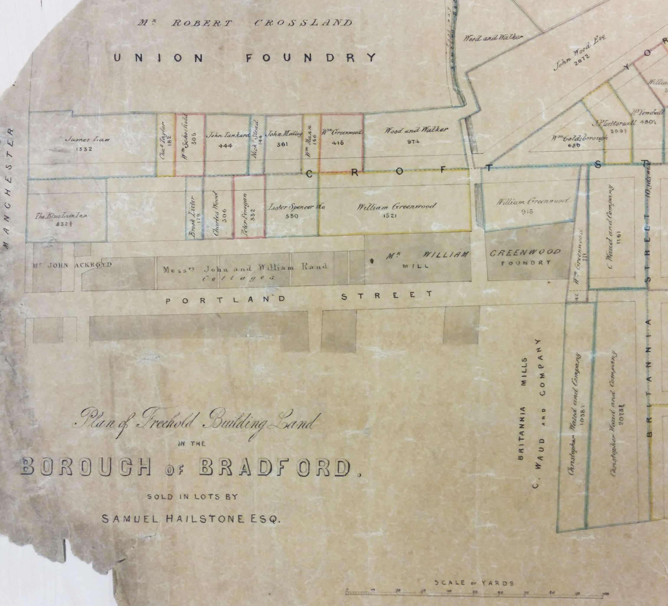 The first two plans preserve a microcosm of industrial life of the mid-nineteenth century, in an area of Bradford not previously examined in this series. The Local Studies Library reserve map collection has two versions of the Field House Estate plan and I have provided a detail from each. They identify the estate as one of the many pieces of Bradford property belonging to the Rev. Godfrey Wright, who has featured more than once in these columns.